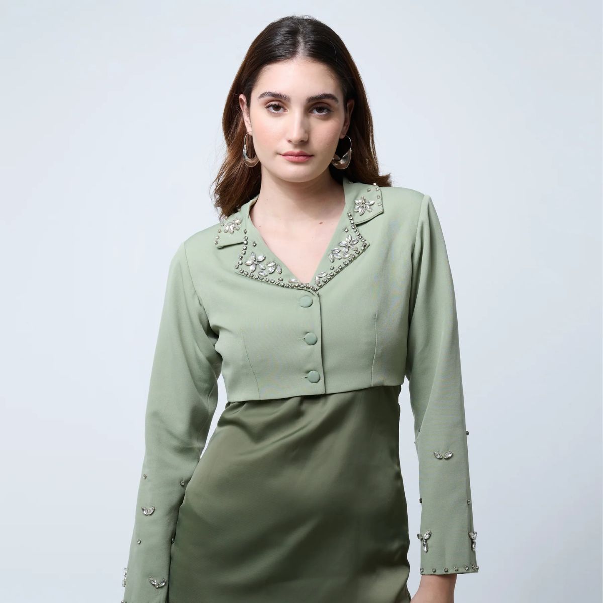 This beautiful Alia cord-set gives you the look of a saree without being one which is comfortable, quick to wear, and perfect for any occasion. Featuring a full-sleeve, boat-neck blouse with hand-beaded detailing, padded comfort, and a refined back design. Paired with a straight flowy skirt and an attached pre-pleated georgette dupatta that drapes effortlessly like a saree. Made in soft printed georgette with subtle foil work, this lightweight ensemble is feminine, comfortable, and perfect for any occasion.