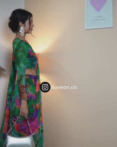 The set comes with a straight, flowy skirt with a side slit for easy movement, paired with an attached pre-pleated georgette dupatta that drapes like a saree, completely hassle-free and ready to wear. Crafted in soft printed georgette with subtle foil detailing, the fabric flows beautifully and feels lightweight and comfortable throughout the day.